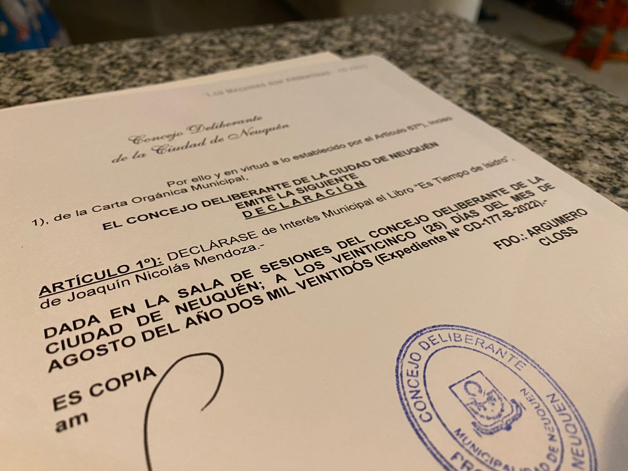 ✔️ Declaración de Interés: para el Libro Es Tiempo de Isidro. Concejo Deliberante, 2022, Neuquén.